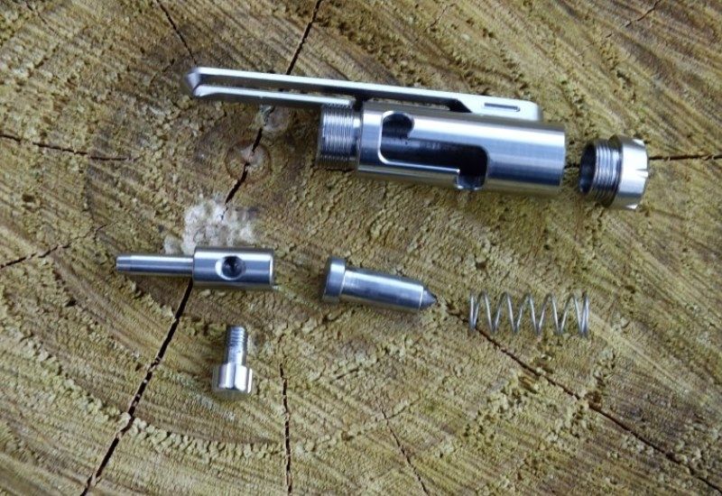 Механизм заключён в серый корпус, выполненный из титанового сплава TC4. Это означает, что внутренние детали NTP30 надёжно защищены от механических повреждений, а сам корпус устойчив к коррозии. Что касается конструктивных особенностей, то стоит отметить подпружиненный переключатель, немного напоминающий оружейный затвор. Перемещение переключателя в верхнее положение заставляет выдвигаться шип стеклобоя, который выполнен из вольфрамового сплава.