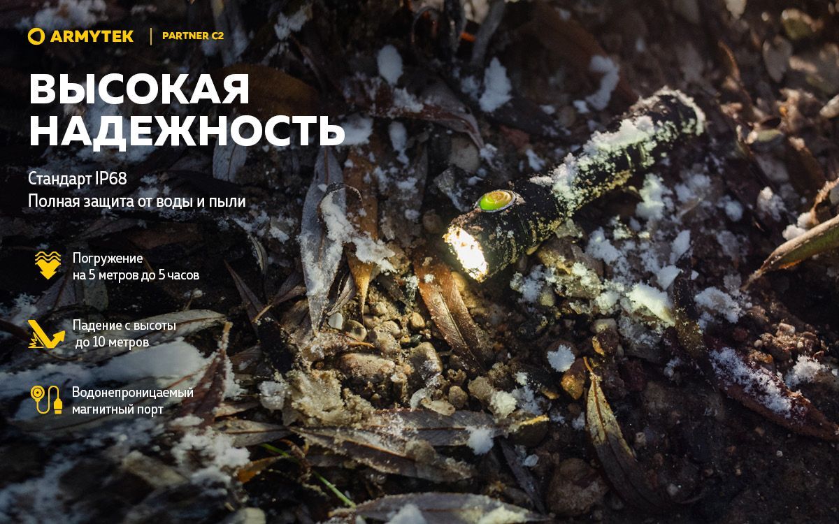 Partner C2 — это высокотехнологичное решение от Armytek, включающее быструю магнитную зарядку и аккумулятор 18650 Li-Ion на 3200 мАч.