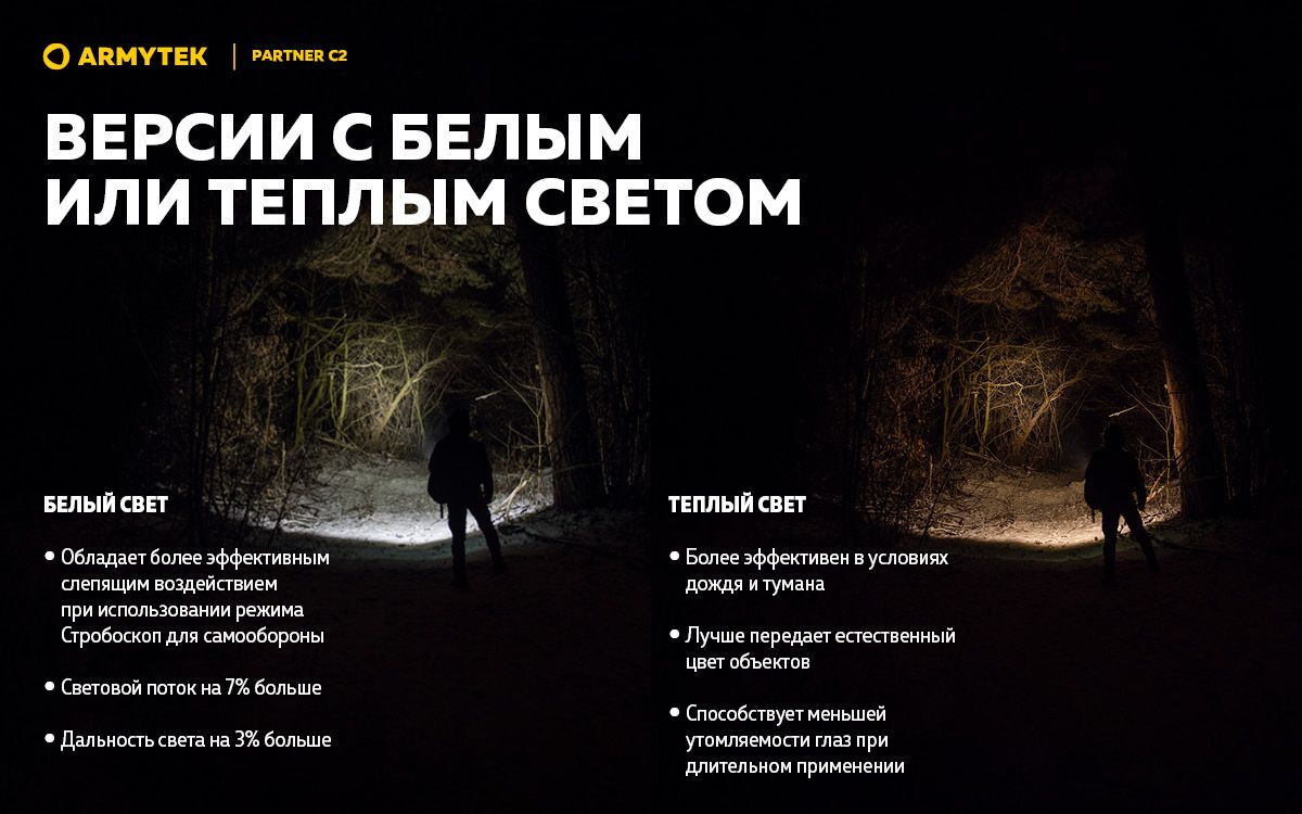 Как и другие фонари из тактической серии Armytek, Partner C2 поддерживает как постоянное, так и временное включение (при полунажатии на тактическую кнопку).