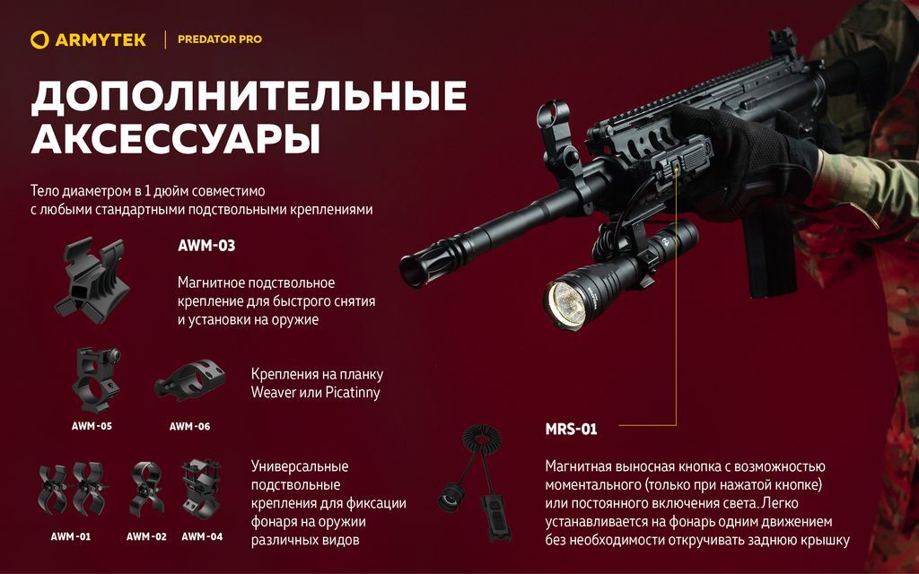 - Стандартное тело диаметром в 1 дюйм совместимо с любыми аксессуарами, в том числе с оригинальной магнитной выносной кнопкой и магнитным подствольным креплением для быстрого снятия и установки на оружие.