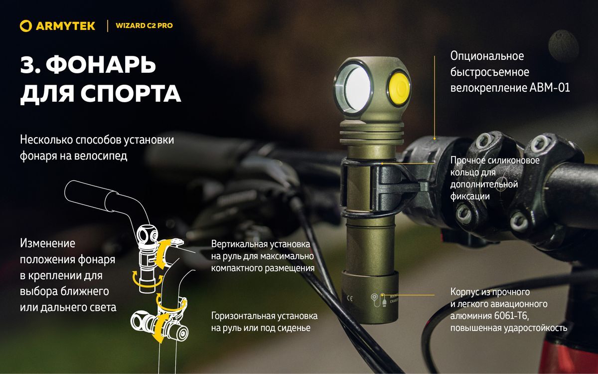 В комплект входит комфортное налобное крепление, клипса для фиксации на одежде или рюкзаке и прочный нейлоновый чехол. Wizard C2 Pro совместим с велокреплением ABM-01 и креплениями на каску серии AHM для индустриальных работ и альпинизма.