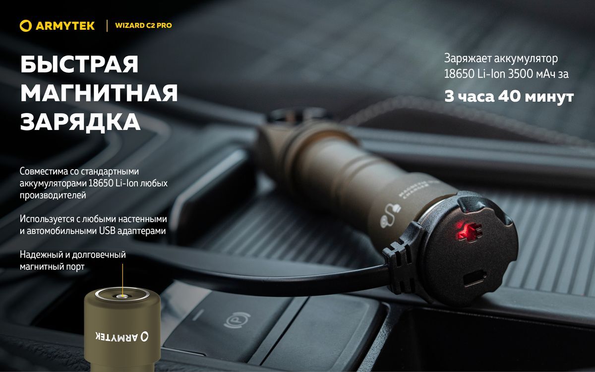 Быстрая магнитная зарядка: комплектный аккумулятор 18650 Li-Ion 3500 мАч заряжается за 3 ч 40 мин.