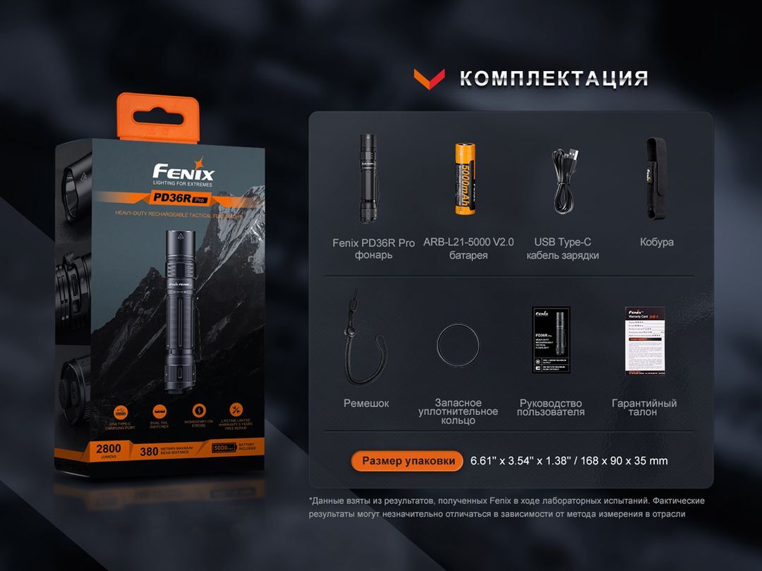 | Комплектация | Фонарь PD36R Pro, аккумулятор Fenix ARB-L21-5000 V2.0 Li-ion, кабель для зарядки USB Type-C, ремешок, чехол, запасное уплотнительное кольцо, инструкция, гарантийный талон | |||||