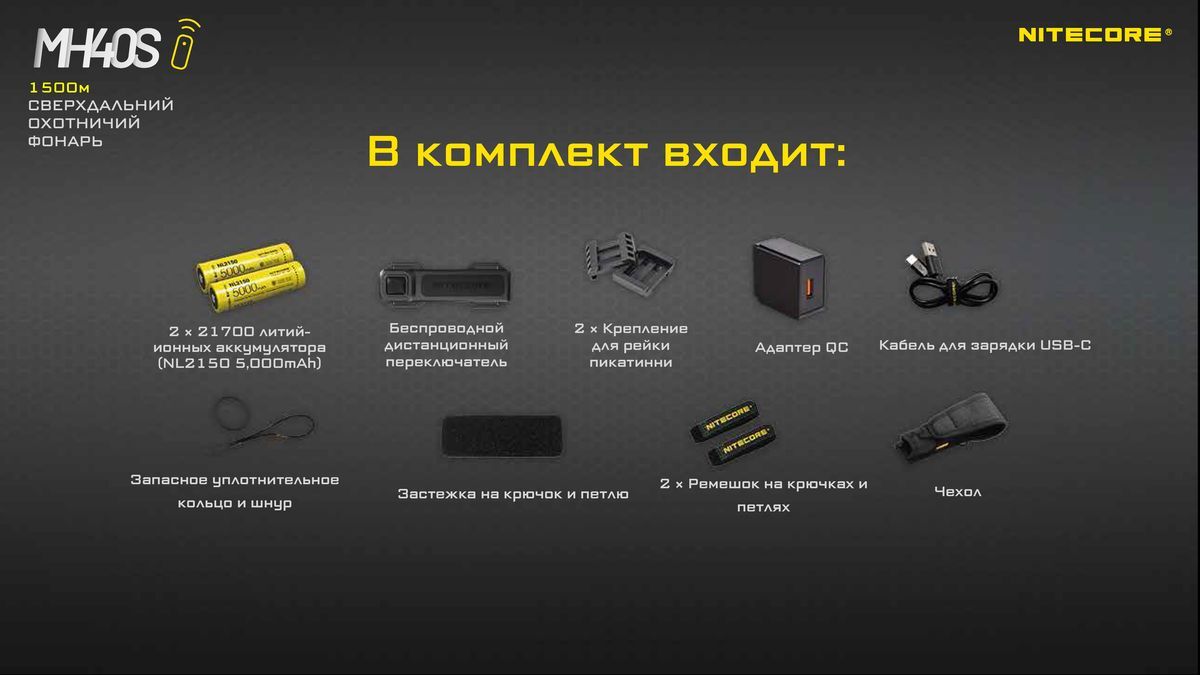 2 литий-ионных аккумулятора NITECORE 21700 (NL2150 5000 мАч), запасное уплотнительное кольцо, ремешок, сетевой адаптер быстрой зарядки, зарядный кабель USB-C, чехол, набор для беспроводного дистанционного переключателя (беспроводной дистанционный переключатель, застежка-липучка, 2 ремня на липучке, 2 крепления для планки Пикатинни).