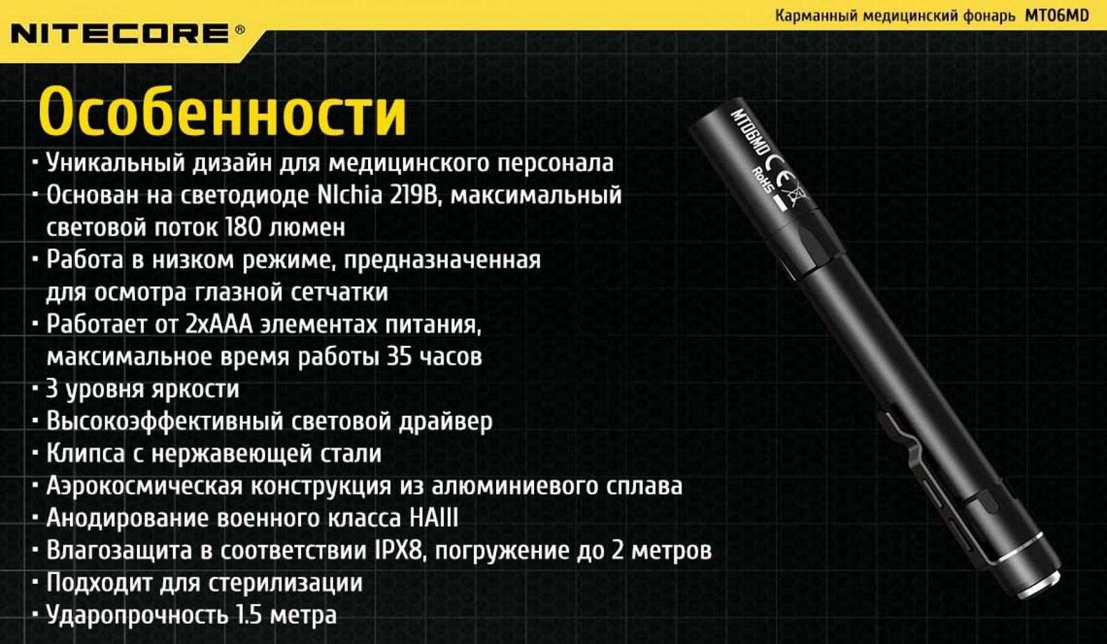 Фонарь водонепроницаем (стандарт IPX8 погружение до 2м) и ударопрочный (до 1,5м), что позволяет его стерилизовать и не опасаться уронить.