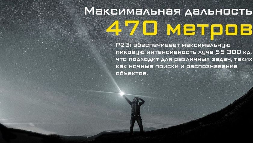 Фонарь обеспечивает максимальную пиковую интенсивность луча 55 300 кд и максимальную дальность 470 метров, что подходит для различных задач, таких как ночные поиски и распознавание объектов.