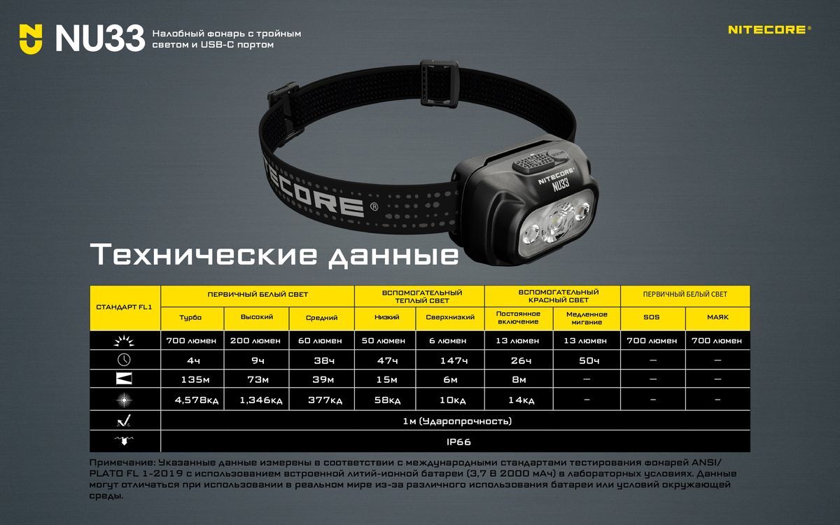 NITECORE NU33 - это USB-перезаряжаемый налобный фонарь с тройным светом и максимальной мощностью 700 люмен. Максимальным радиусом действия 135 метров. Оснащен зарядным портом USB-C, время зарядки составляет прибл. 1,5 часа, в то время как он изготовлен из прочного ПК и алюминиево-металлических материалов с весом всего 95,5 г.