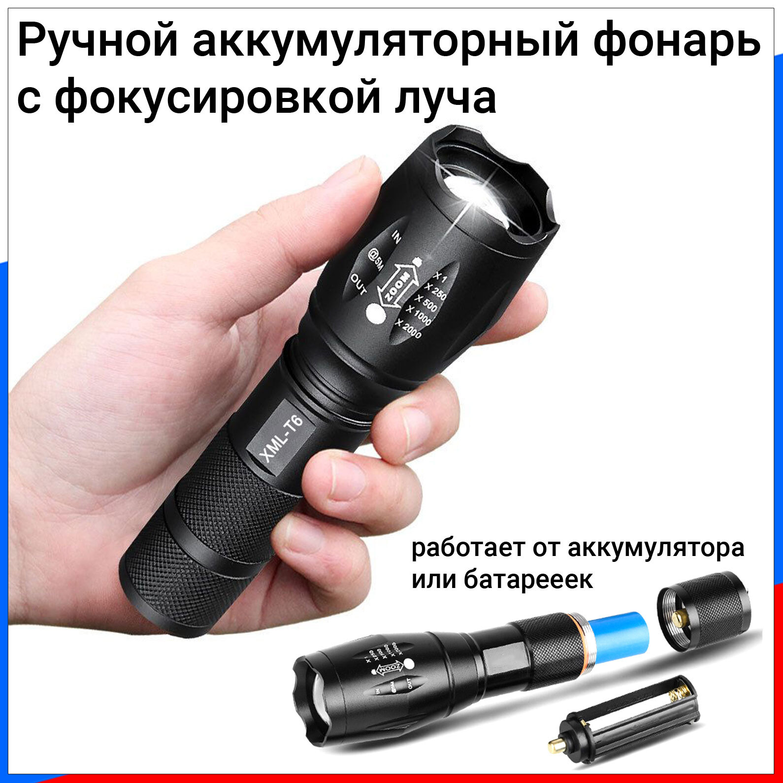 Универсальный ручной фонарь с изменяемой фокусировкой луча. Три режима яркости -максимальный, минимальный, стробоскоп (моргающий)