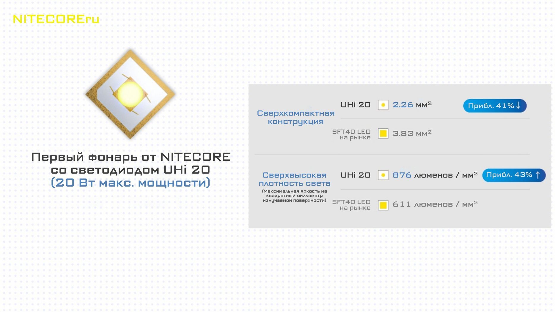 Задействуется светодиод UHi 20 с мощностью до 1 000 люмен