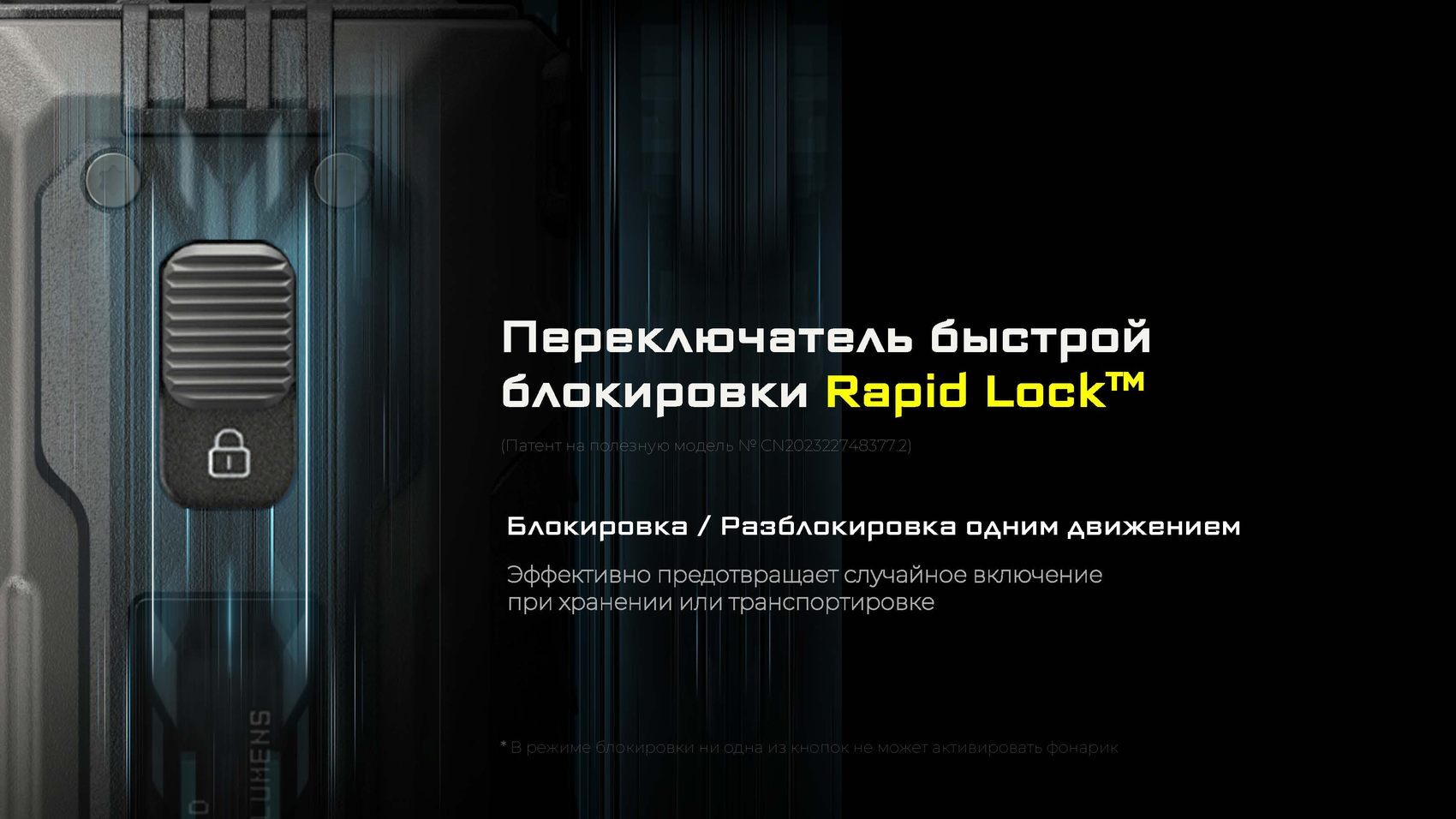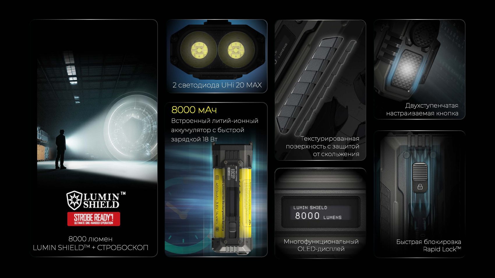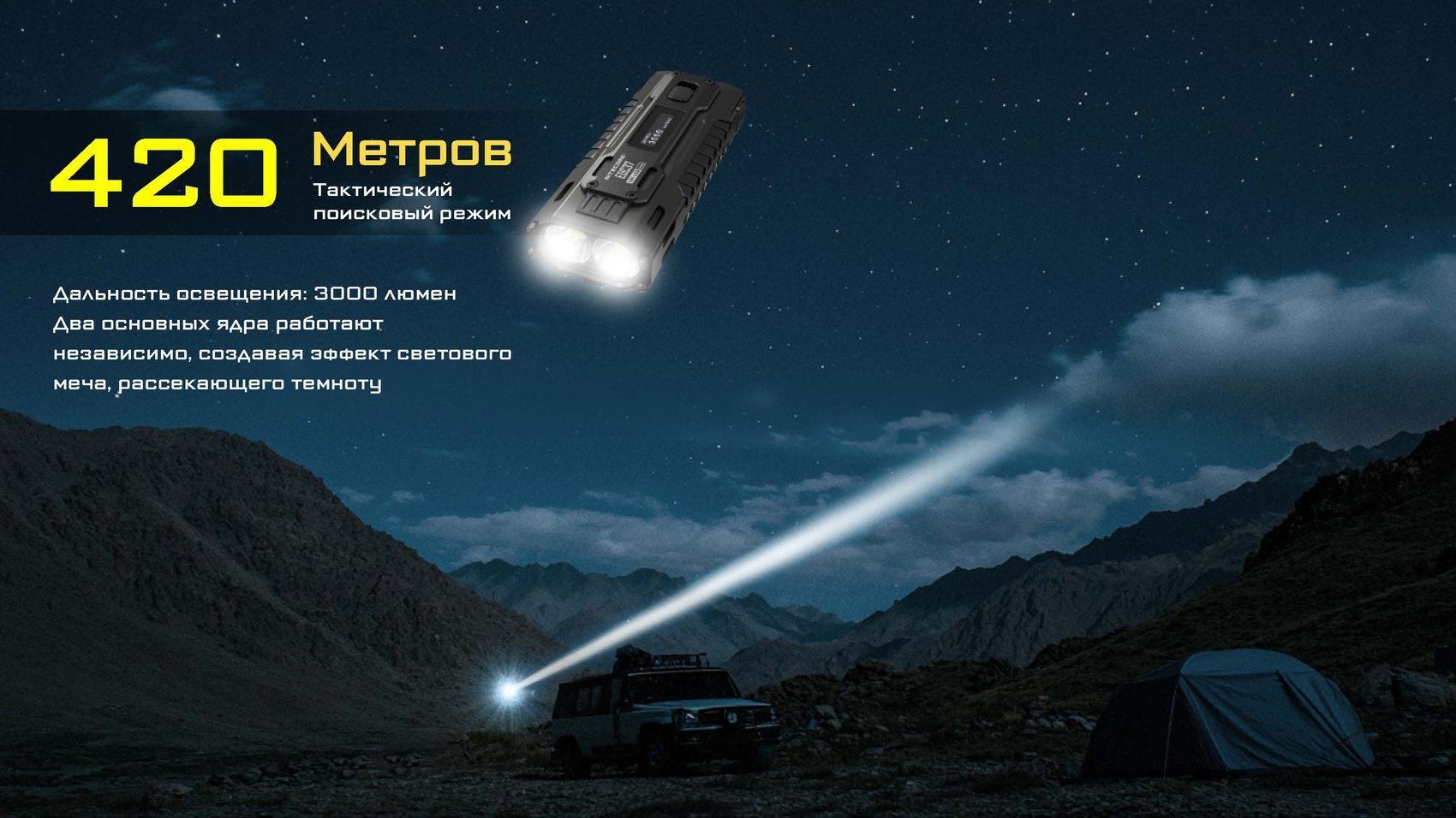 В его основе лежат два мощных светодиода NiteLab UHi 20 MAX LED, которые в режиме LUMIN SHIELD выдают ослепительные 8000 люмен, создавая широкий мощный луч. В режиме SEARCH сфокусированный луч мощностью 3000 люмен пробивает дистанцию до 420 метров, что делает его идеальным для поисковых операций.