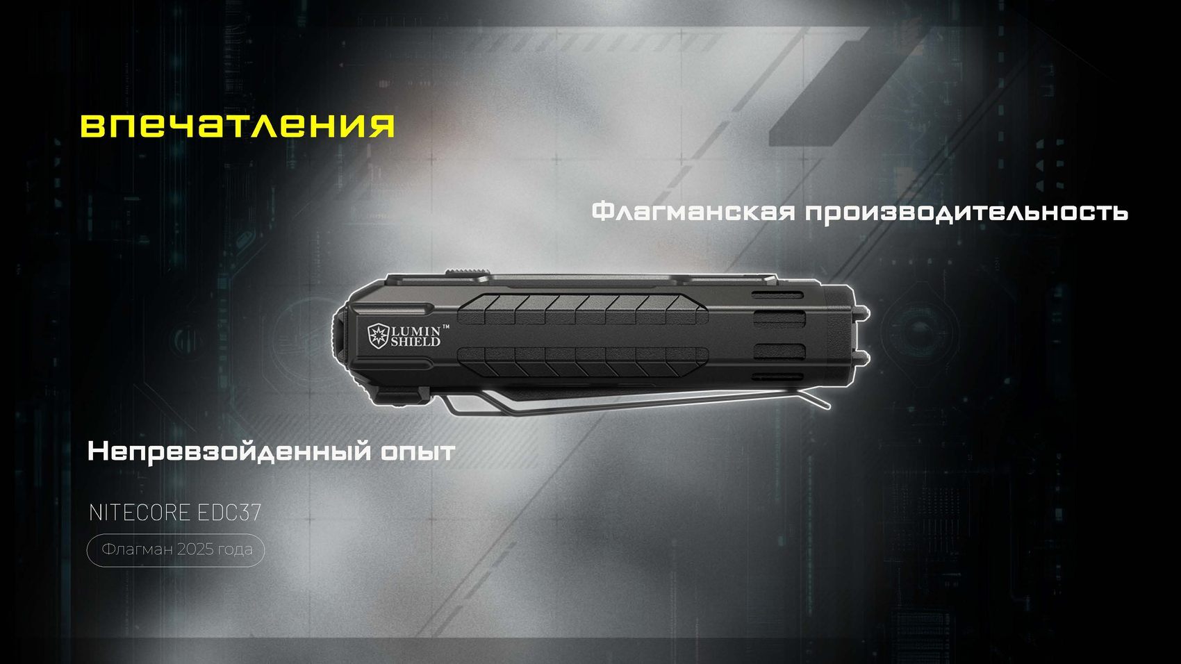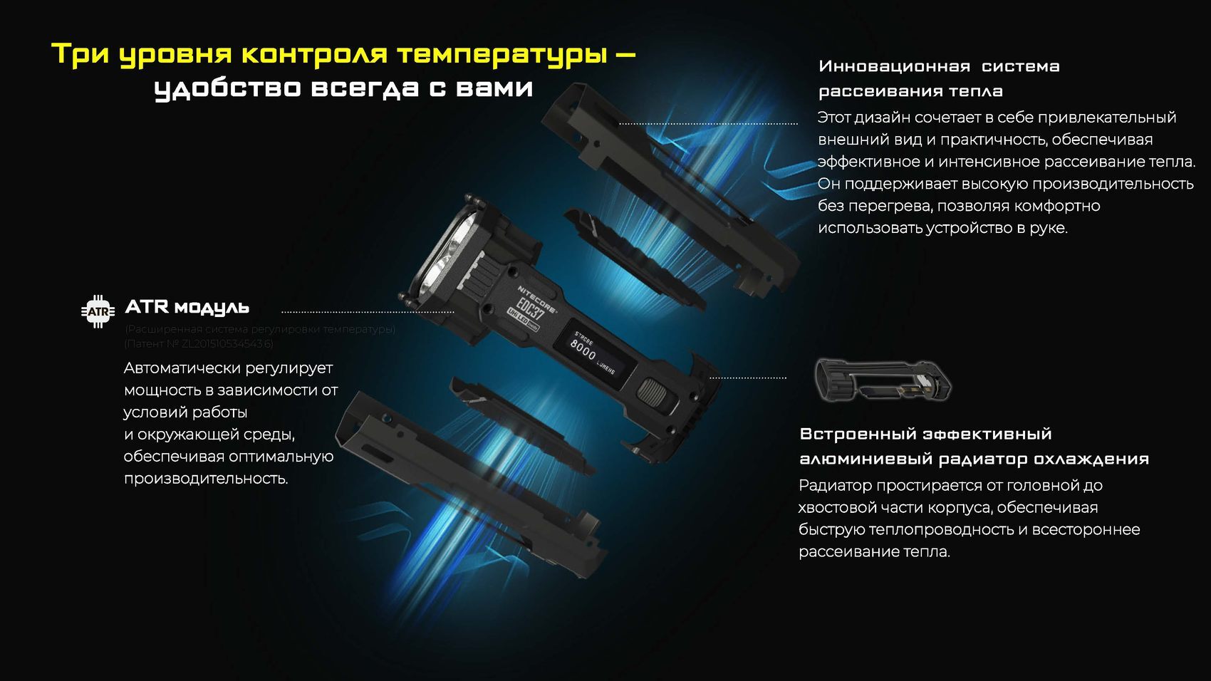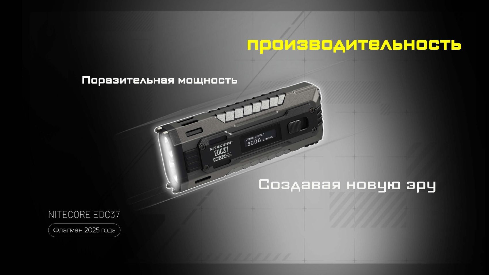 Одной из главных инноваций EDC37 является встроенный OLED-дисплей, который в реальном времени информирует пользователя о текущем режиме яркости, уровне заряда аккумулятора и оставшемся времени работы. Это обеспечивает полный контроль над устройством и позволяет эффективно планировать его использование.