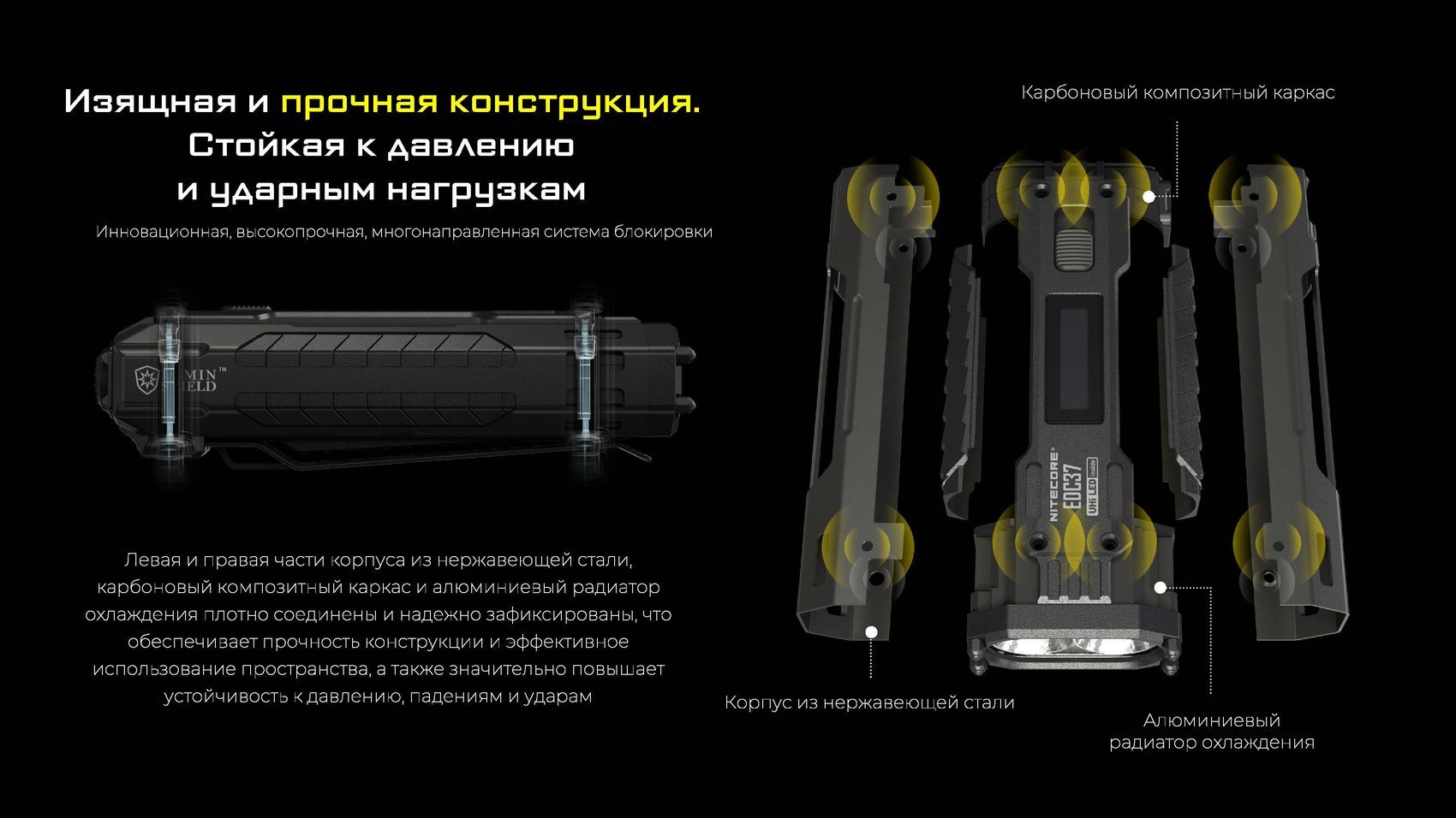 Корпус EDC37 выполнен из высокопрочного аэрокосмического алюминиевого сплава с PVD-покрытием, а рама из карбонового волокна обеспечивает исключительную структурную прочность. Встроенный аккумулятор на 8000 мАч обеспечивает длительное время работы — до 190 часов в режиме ULTRALOW. Зарядка осуществляется через удобный порт USB-C.