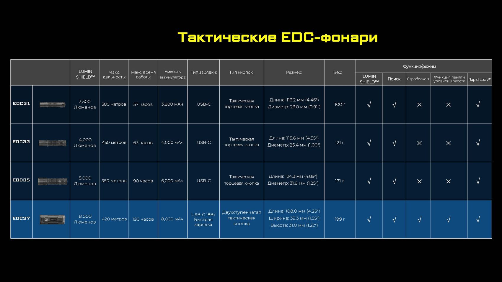 Благодаря двойной торцевой кнопке управления, функциям блокировки Rapid Lock и съемным керамическим стеклобоям, которые при необходимости можно заменить на обычные винты, EDC37 станет вашим надёжным спутником как в повседневных ситуациях, так и в экстремальных условиях.