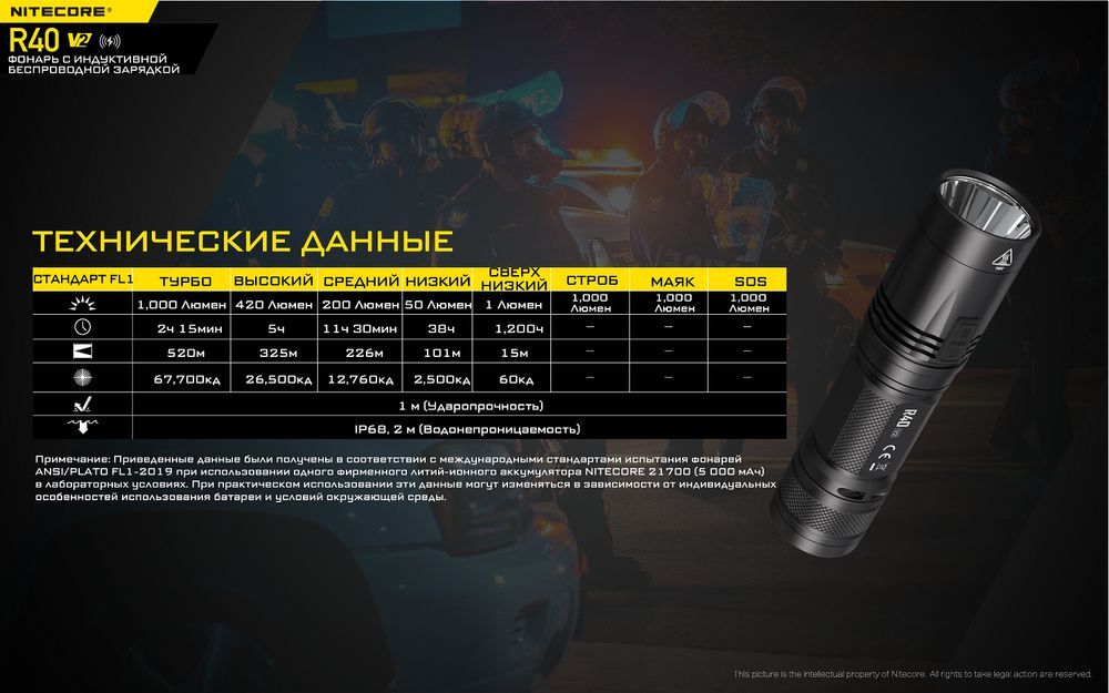 Nitecore R40 V2 - это новая версия фонаря с индуктивной беспроводной зарядкой. Фонарь специально разработан для правоохранительных органов и поисково-спасательных служб и выделяется как своим относительно эргономичным дизайном, так и возможностью зарядки аккумулятора от разных источников, в том числе и от специальных док-станций.