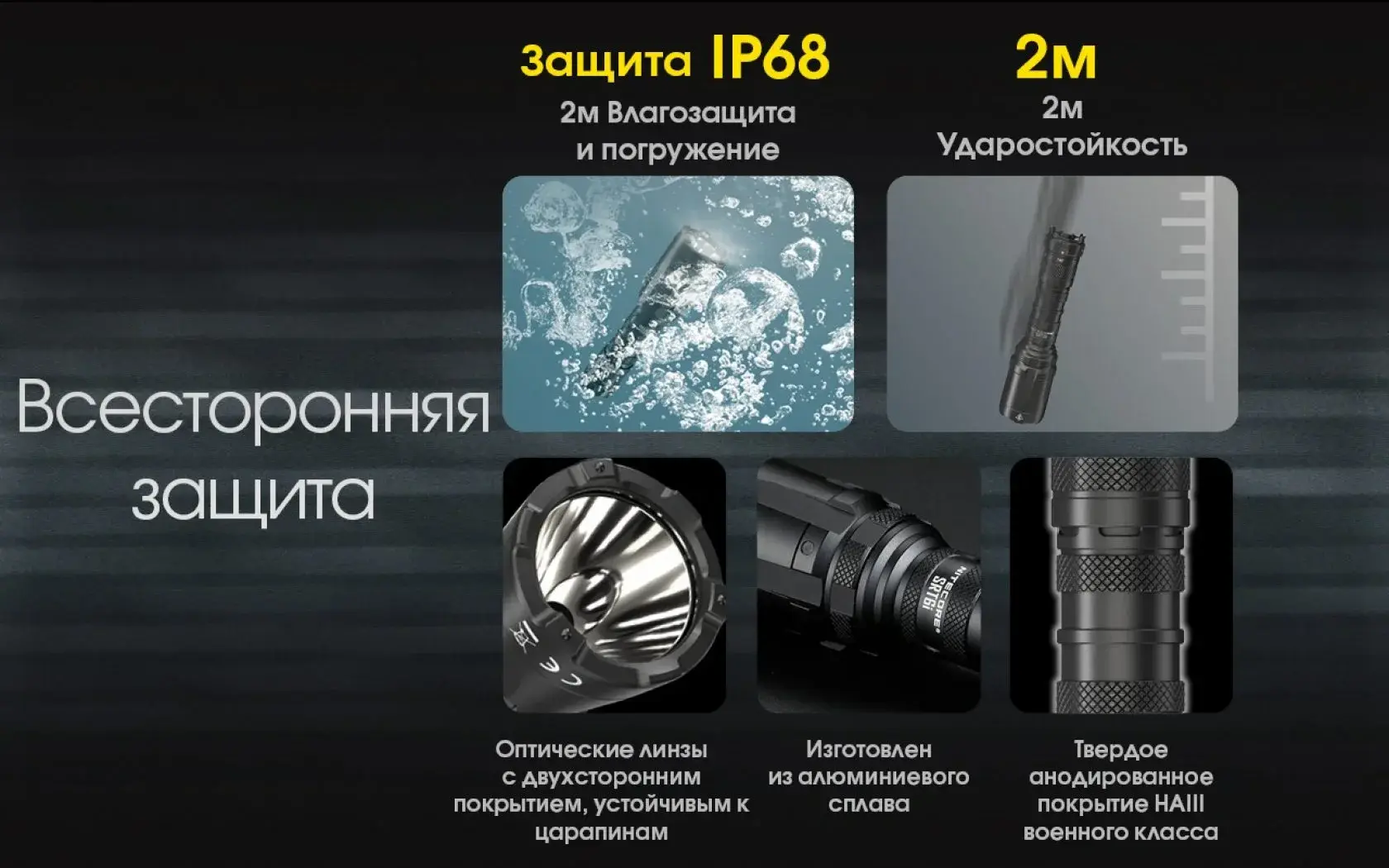 Фонарь, Литий-ионный перезаряжаемый аккумулятор NITECORE 21700i (NL2150HPi 5000 мАч), аккумуляторный магазин CR123, чехол-кобура, клипса, ремешок, запасное уплотнительное кольцо, зарядный кабель USB-C.