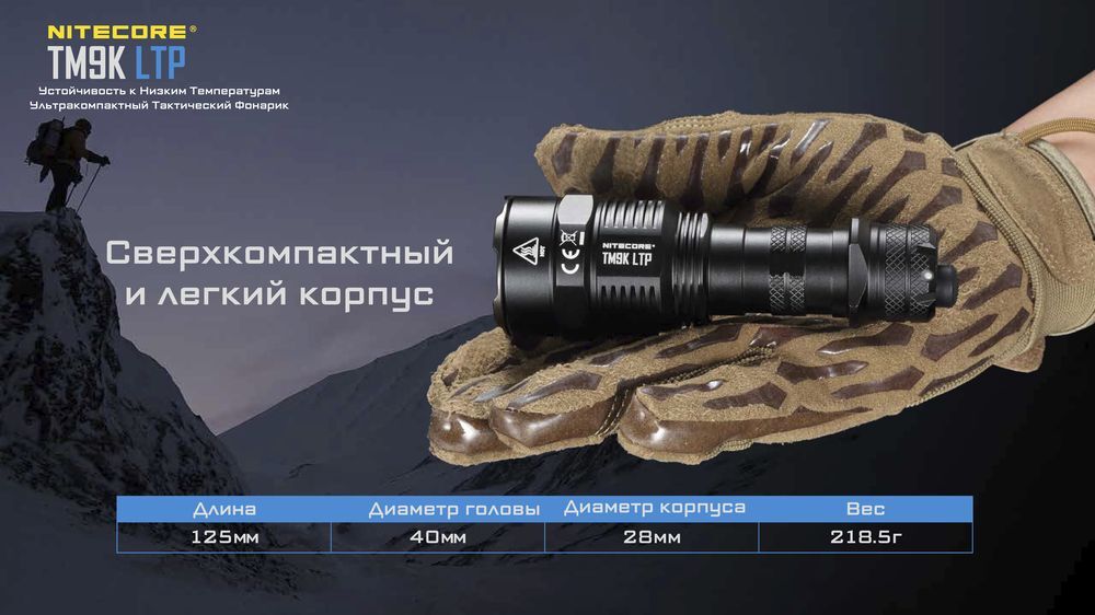 NITECORE TM9K LTP это модернизированный тактический фонарь невероятной мощности и благодаря встроенному морозостойкому аккумулятору фонарь устойчив к низким температурам, специально разработанный для работы при низких температурах при температуре -40 °C, данная модель считается одним из самых ярких представителей линейки "Tiny Monster".