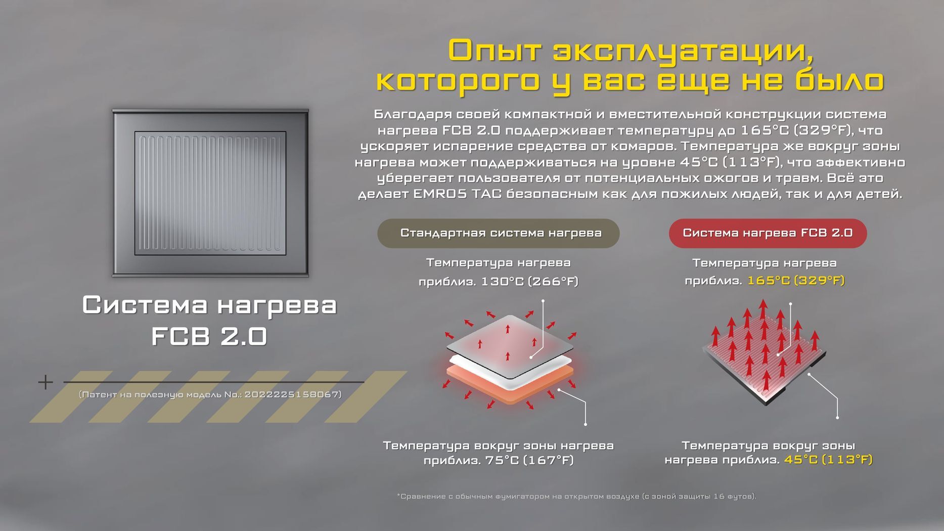 Фумигатор оснащен системой нагрева FCB 2.0, которая повышает пиковую температуру нагрева до 165°C (329°F) во время нагрева. Это ускоряет эффективность испарения комариного репеллента, одновременно направляя тепло вверх, снижая внешнюю температуру зоны нагрева до 45°C (113°F), что предотвращает ожоги даже без теплоизоляционной защиты.