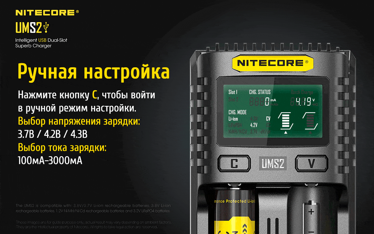 UMS2 совместимо с перезаряжаемыми литий-ионными аккумуляторами 3.6V, 3.7V и 3.8V, перезаряжаемыми элементами питания Ni-MH / Ni-Cd 1.2V и LiFePO4 аккумуляторами 3.2V.
