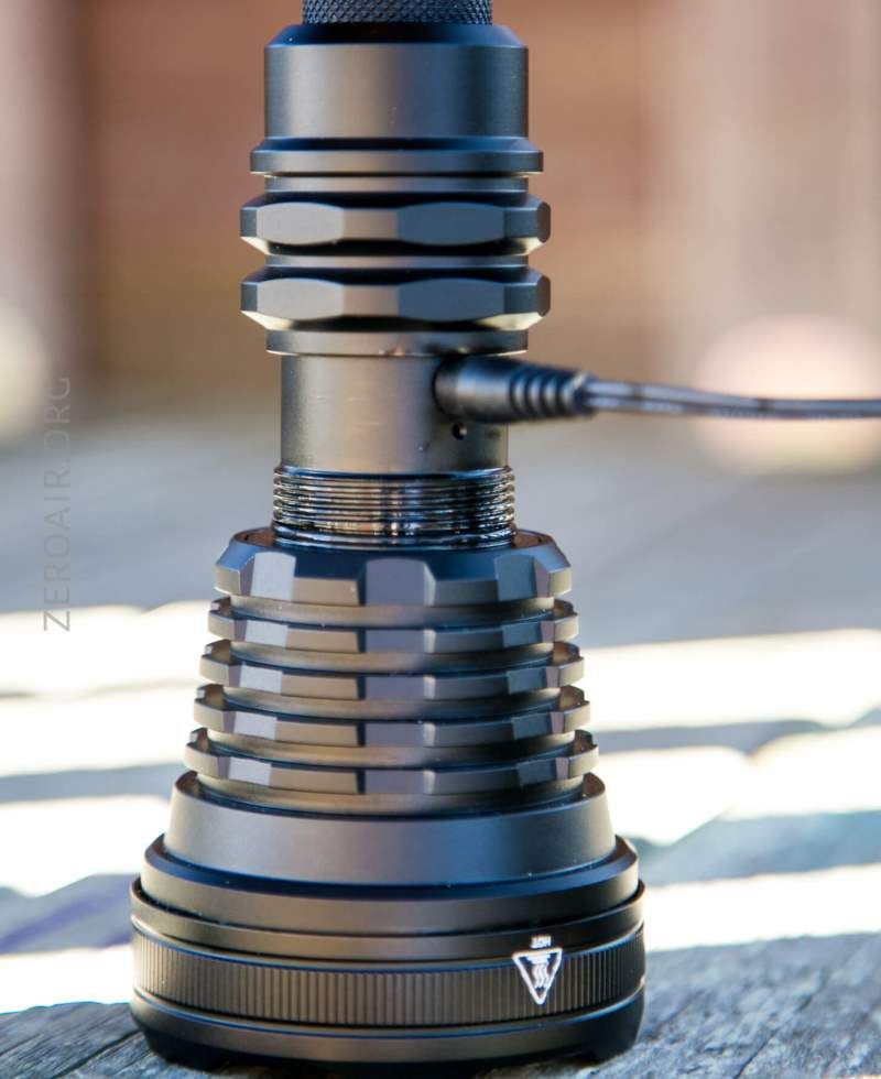 Головная часть фонаря опоясана многочисленными и глубокими рёбрами охлаждения.