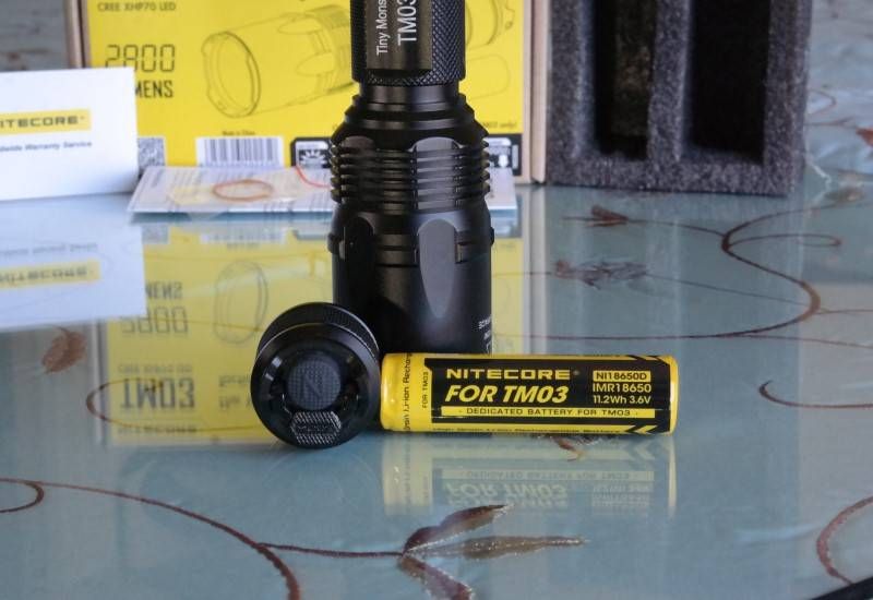Комплект поставки включает в себя сам фонарь TM03, перезаряжаемый аккумулятор, уплотнительное кольцо, нейлоновый чехол и инструкцию. Зарядное устройство в комплект не входит. Также отсутствует клипс для ношения на ремне или кармане, вероятно, из-за того, что фонарь несколько великоват для этого.